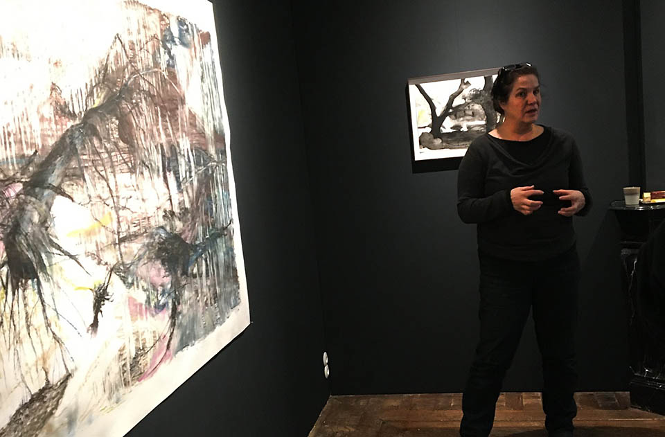 Kunstenares Emmy Bergsma bij een werk van haar in Galerie Getekend.
