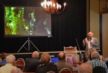 De middag begon met een lezing van voorzitter Peter Brinkman met daarin de ontwikkelingen rond de Stichting Tijd van het afgelopen jaar, en een visie op de komende jaren. De 2 speerpunten die Brinkman benoemde waren de inzichten die hij kreeg na een uitspraak van Louis, namelijk "Tijd is het eerste geboorterecht van een mens", en de ervaring dat je op de Ecokathedraal nooit alleen bent, maar je omringt weet door allerlei kleine en grote samenwerkingsverbanden: symbiose. Op de foto hiernaast is te zien dat Louis Le Roy toekijkt op de zaal. Zijn aanwezigheid werd duidelijk gevoeld. |