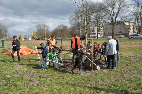 Wethouder Age Hartsuiker heeft in het kader van de Nationale Boomfeest samen met groep 5 van de basisschool De Letterbeam 11 nieuwe bomen geplant in het verlengde van het Le Roy plantsoen aan de Oranje Nassaulaan in Heerenveen Midden.